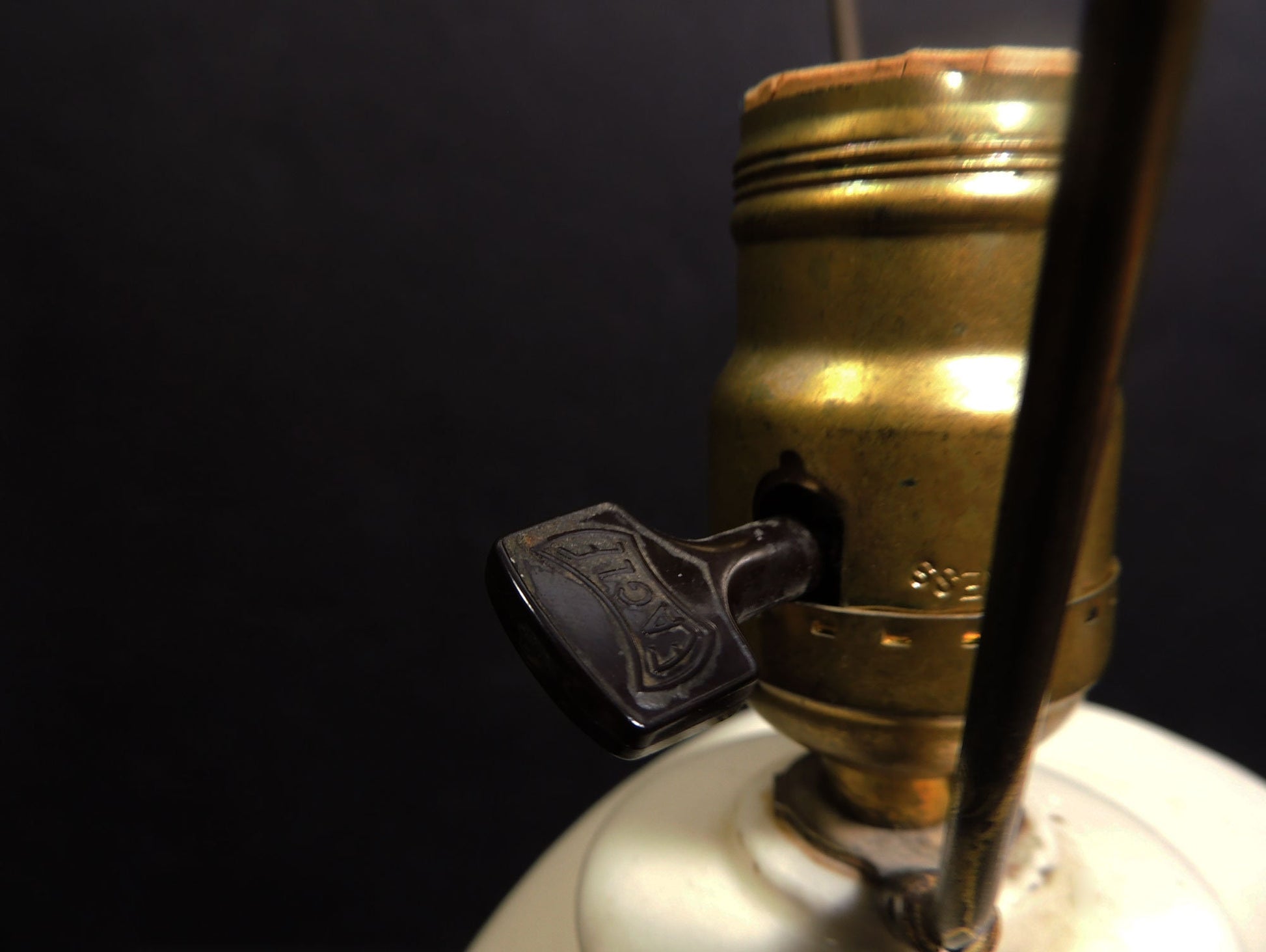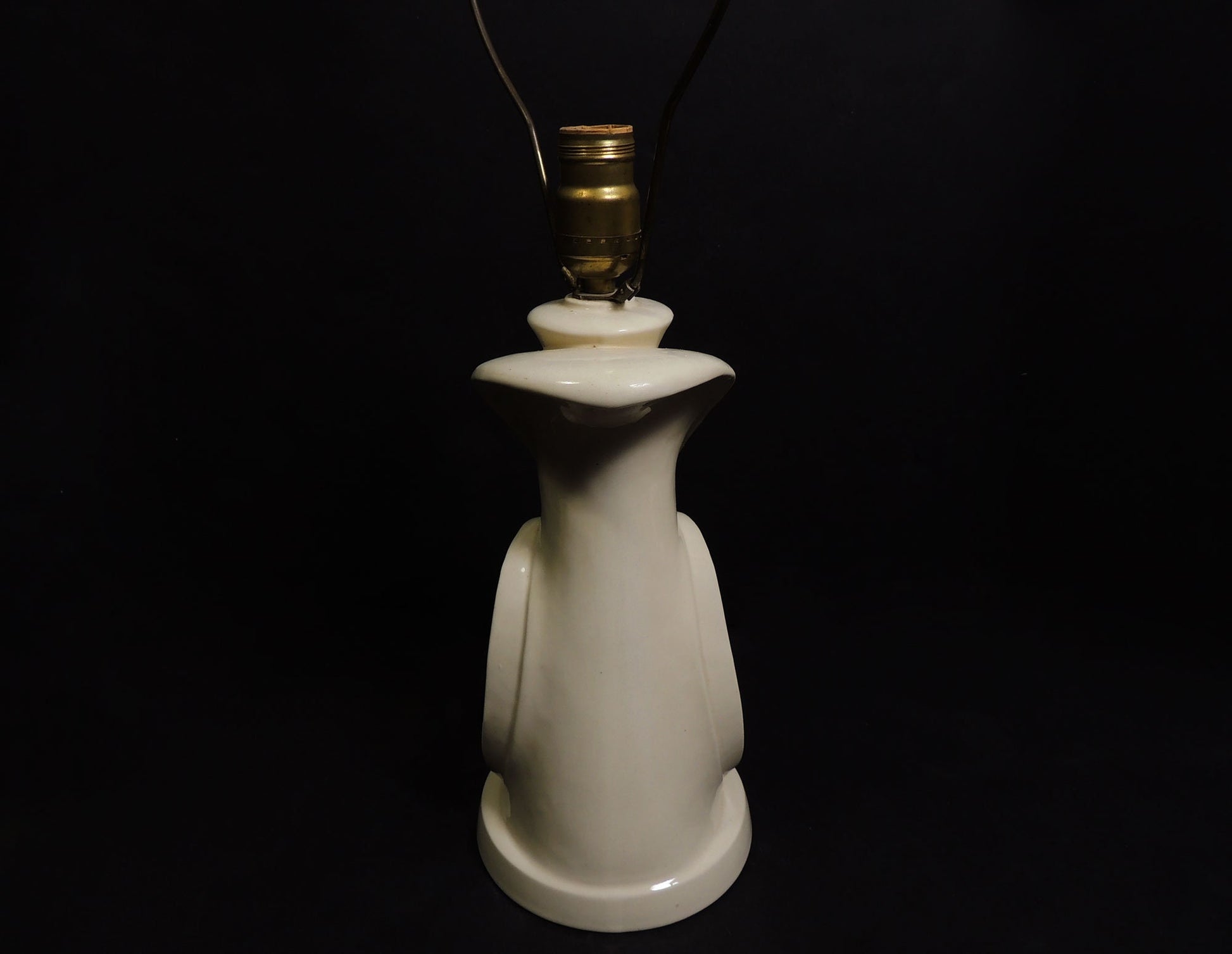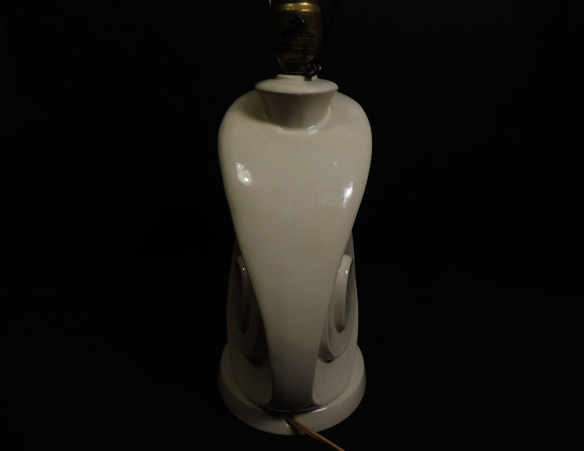 Condition: works, signs wear consistent with its age, minor craquelure mostly on the ceramic finial, original power cord and plug, structurally sound.