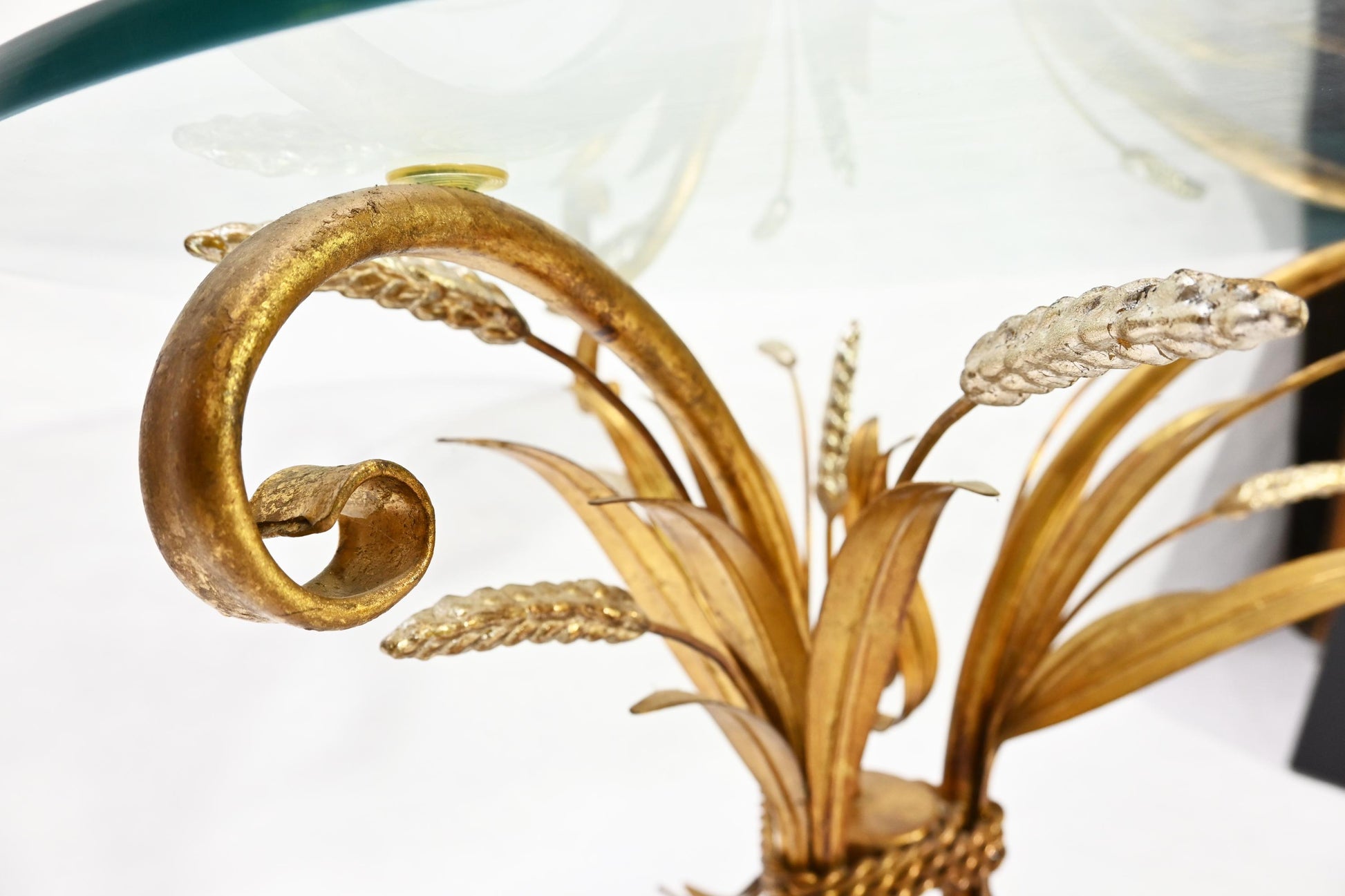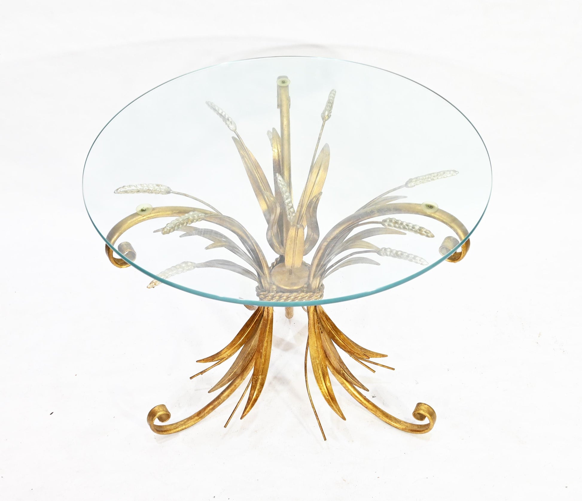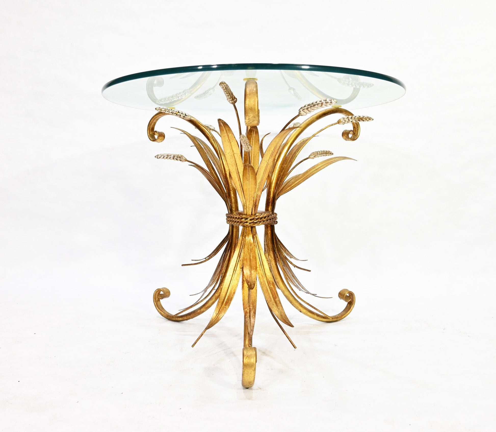 Modernist Era Hollywood Regency Wheat Metal Gilt Tole Round Glass Side Table