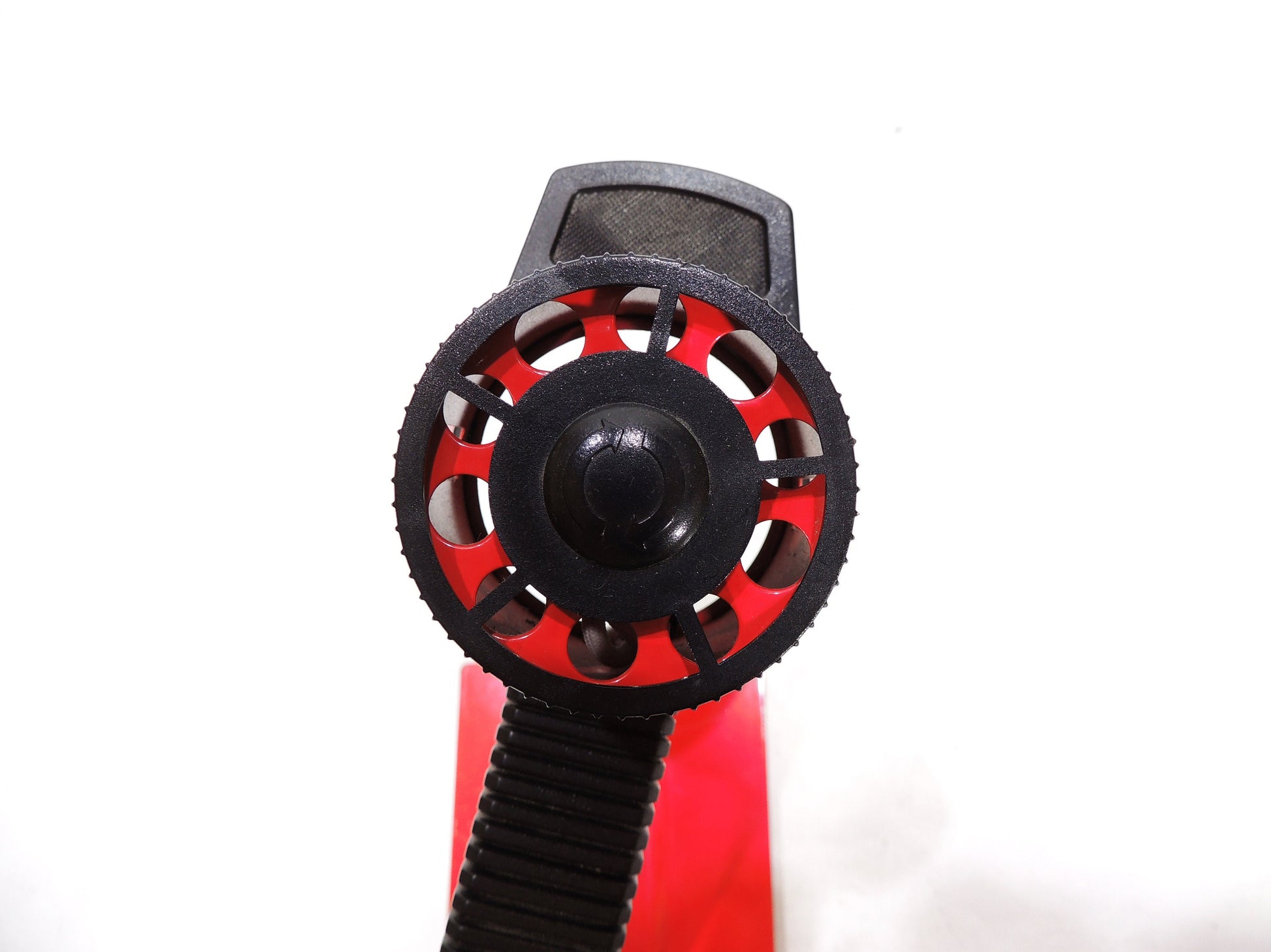Metal base, metal shade, metal gooseneck, flex plastic cover, rotary wheel switch is located on top of the shade